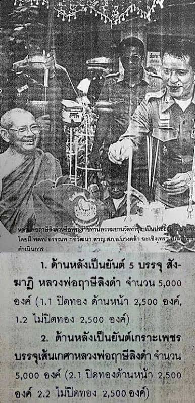 จำนวนสร้าง 10,000 องค์ แบ่งเป็น รุ่นเกษา ปิดทองสร้าง 2,500 องค์ รุ่นเกษา ไม่ปิดทองสร้าง 2,500 องค์ รุ่นสังฆาฏิ ปิดทองสร้าง 2,500 องค์ รุ่นสังฆาฏิ ไม่ปิดทองสร้าง 2,500 องค์ รุ่นนี้ผสมมวลสารมากมาย ผงมงคล 108 อย่าง ใครอยากมีเกษาของหลวงพ่อไว้บูชาแนะนำรุ่นนี้เลยครับ องค์นี้เกษาเพียบ